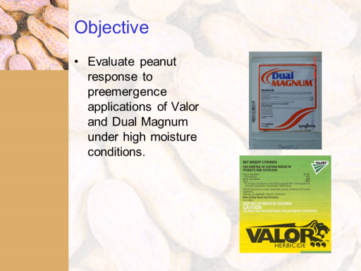 Objective<BR>Evaluate peanut response to preemergence applications of Valor and Dual Magnum under high moisture conditions.<BR>