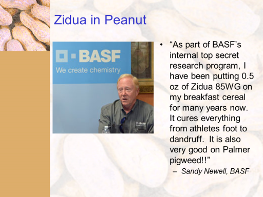 Zidua in Peanut<BR>“As part of BASF’s internal top secret research program, I have been putting 0.5 oz of Zidua 85WG on my breakfast cereal for many years now.  It cures everything from athletes foot to dandruff.  It is also very good on Palmer pigweed!!” <BR>Sandy Newell, BASF<BR>