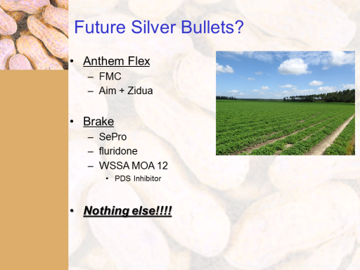Future Silver Bullets?<BR>Anthem Flex <BR>FMC <BR>Aim + Zidua <BR> <BR>Brake <BR>SePro <BR>fluridone <BR>WSSA MOA 12 <BR>PDS Inhibitor <BR> <BR>Nothing else!!!!<BR>