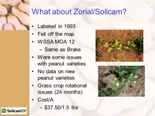 What about Zorial/Solicam?<BR>Labeled in 1993 <BR>Fell off the map <BR>WSSA MOA 12 <BR>Same as Brake <BR>Were some issues with peanut varieties <BR>No data on new peanut varieties <BR>Grass crop rotational issues (24 months) <BR>Cost/A <BR>$37.50/1.5 lbs<BR>