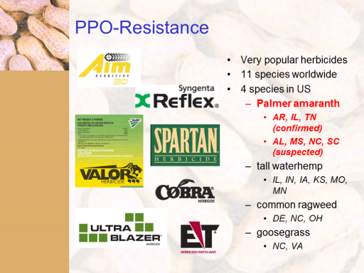PPO-Resistance<BR>Very popular herbicides  <BR>11 species worldwide <BR>4 species in US <BR>Palmer amaranth  <BR>AR, IL, TN (confirmed) <BR>AL, MS, NC, SC (suspected) <BR>tall waterhemp <BR>IL, IN, IA, KS, MO, MN <BR>common ragweed <BR>DE, NC, OH <BR>goosegrass <BR>NC, VA<BR>