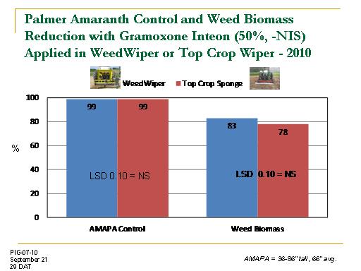 Palmer Amaranth Control and Weed Biomass Reduction with Gramoxone Inteon (50%, -NIS) Applied in WeedWiper or Top Crop Wiper - 2010<BR>PIG-07-10 <BR>September 21 <BR>29 DAT<BR> %<BR>LSD 0.10 = NS<BR>AMAPA = 36-86” tall, 66” avg.<BR>