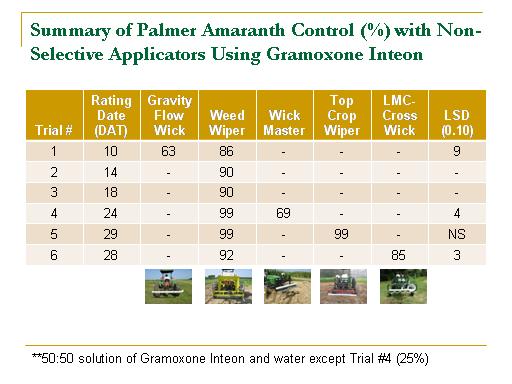 Summary of Palmer Amaranth Control (%) with Non-Selective Applicators Using Gramoxone Inteon<BR>**50:50 solution of Gramoxone Inteon and water except Trial #4 (25%)<BR>