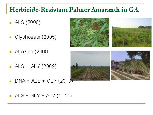 Herbicide-Resistant Palmer Amaranth in GA<BR>ALS (2000) <BR> <BR>Glyphosate (2005) <BR> <BR>Atrazine (2009) <BR> <BR>ALS + GLY (2009) <BR> <BR>DNA + ALS + GLY (2010) <BR> <BR>ALS + GLY + ATZ (2011)<BR>