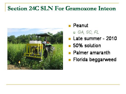 Section 24C SLN For Gramoxone Inteon<BR>Peanut <BR>GA, SC, FL <BR>Late summer - 2010 <BR>50% solution <BR>Palmer amaranth <BR>Florida beggarweed <BR>
