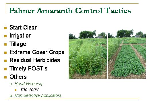 Palmer Amaranth Control Tactics<BR>Start Clean <BR>Irrigation <BR>Tillage <BR>Extreme Cover Crops <BR>Residual Herbicides <BR>Timely POST’s <BR>Others <BR>Hand-Weeding <BR>$30-100/A <BR>Non-Selective Applicators<BR>