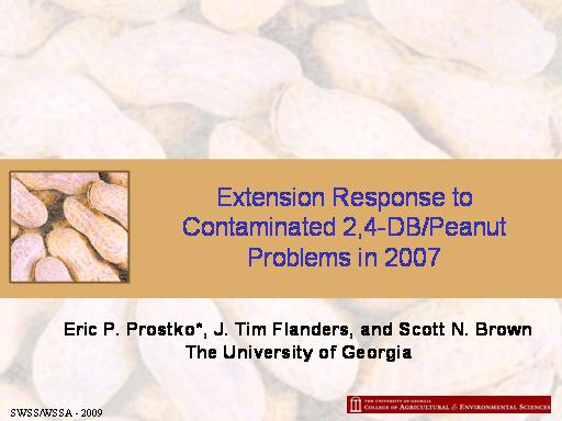 Extension Response to Contaminated 2,4-DB/Peanut  Problems in 2007 <BR>Eric P. Prostko*, J. Tim Flanders, and Scott N. Brown <BR>The University of Georgia<BR>SWSS/WSSA - 2009<BR>
