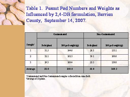 Table 1.  Peanut Pod Numbers and Weights as Influenced by 2,4-DB formulation, Berrien County,  September 14, 2007.<BR>1Contaminated and Non-Contaminated samples collected from same field. <BR>2Average of 10 plants.<BR>