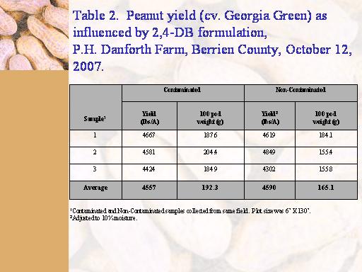 Table 2.  Peanut yield (cv. Georgia Green) as influenced by 2,4-DB formulation,  <BR>P.H. Danforth Farm, Berrien County, October 12, 2007. <BR>1Contaminated and Non-Contaminated samples collected from same field.  Plot size was 6’ X 130’.  <BR>2Adjusted to 10% moisture. <BR>