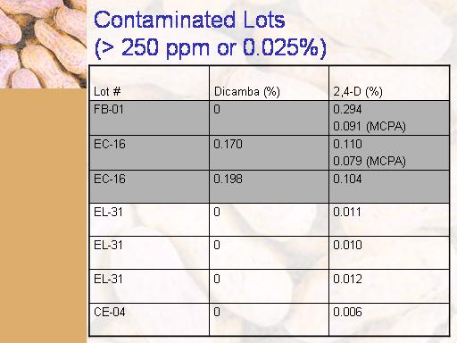 Contaminated Lots (> 250 ppm or 0.025%)<BR>