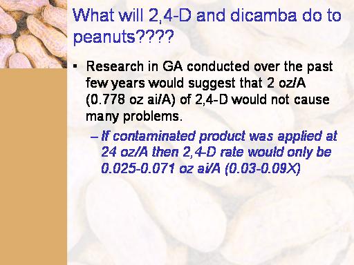 What will 2,4-D and dicamba do to peanuts????<BR>Research in GA conducted over the past few years would suggest that 2 oz/A (0.778 oz ai/A) of 2,4-D would not cause many problems. <BR>If contaminated product was applied at 24 oz/A then 2,4-D rate would only be 0.025-0.071 oz ai/A (0.03-0.09X) <BR> <BR> <BR> <BR>