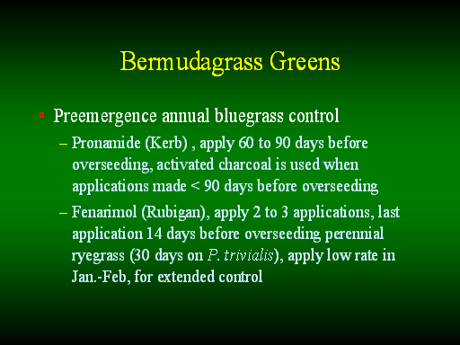 <LI>Pronamide (Kerb) , apply 60 to 90 days before overseeding, activated charcoal is used when applications made < 90 days before overseeding