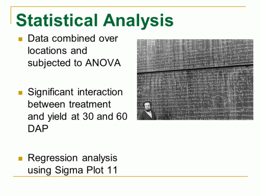 Data combined over locations and subjected to ANOVA <BR> <BR>Significant interaction between treatment and yield at 30 and 60 DAP <BR> <BR>Regression analysis using Sigma Plot 11<BR>Statistical Analysis<BR>