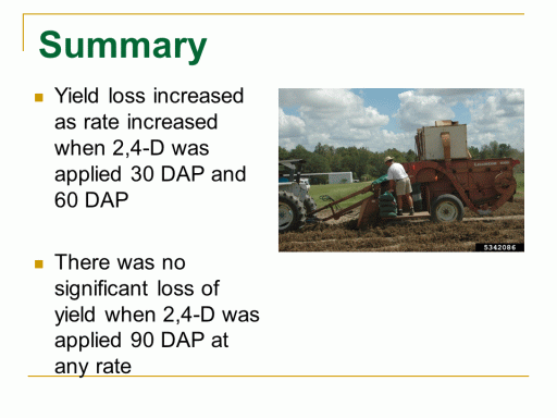Summary<BR>Yield loss increased as rate increased when 2,4-D was applied 30 DAP and 60 DAP <BR> <BR>There was no significant loss of yield when 2,4-D was applied 90 DAP at any rate <BR> <BR>
