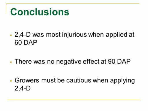 Conclusions<BR>2,4-D was most injurious when applied at 60 DAP <BR> <BR>There was no negative effect at 90 DAP <BR> <BR>Growers must be cautious when applying 2,4-D <BR>