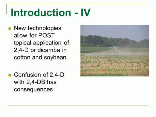 Introduction - IV<BR>New technologies allow for POST topical application of 2,4-D or dicamba in cotton and soybean <BR> <BR>Confusion of 2,4-D with 2,4-DB has consequences <BR> <BR>