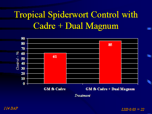 Tropical Spiderwort Control with Cadre + Dual Magnum<BR>114 DAP<BR>LSD 0.05 = 22<BR>