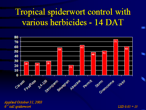 Tropical spiderwort control with various herbicides - 14 DAT<BR>Applied October 31, 2003