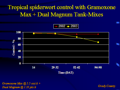 Tropical spiderwort control with Gramoxone Max + Dual Magnum Tank-Mixes<BR>Gramoxone Max @ 5.5 ozs/A +