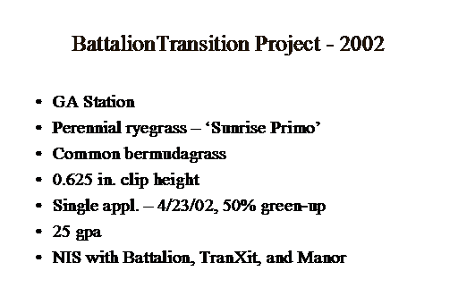 BattalionTransition Project - 2002<BR>GA Station <BR>Perennial ryegrass – ‘Sunrise Primo’ <BR>Common bermudagrass <BR>0.625 in. clip height <BR>Single appl. – 4/23/02, 50% green-up <BR>25 gpa <BR>NIS with Battalion, TranXit, and Manor<BR>
