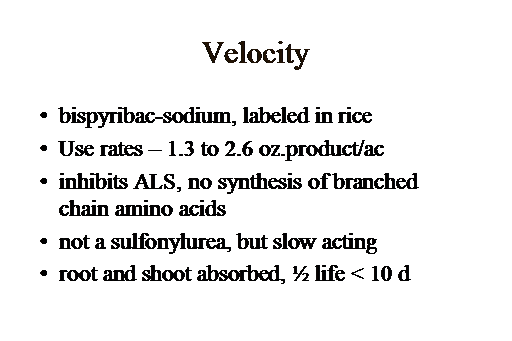 Velocity<BR>bispyribac-sodium, labeled in rice <BR>Use rates – 1.3 to 2.6 oz.product/ac <BR>inhibits ALS, no synthesis of branched chain amino acids <BR>not a sulfonylurea, but slow acting <BR>root and shoot absorbed, ½ life < 10 d<BR>