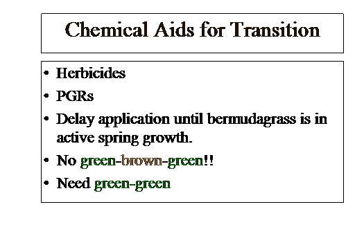 Chemical Aids for Transition<BR>Herbicides <BR>PGRs <BR>Delay application until bermudagrass is in active spring growth. <BR>No green-brown-green!! <BR>Need green-green<BR>
