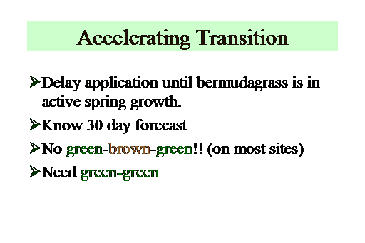 Accelerating Transition<BR>Delay application until bermudagrass is in active spring growth. <BR>Know 30 day forecast <BR>No green-brown-green!! (on most sites) <BR>Need green-green <BR>