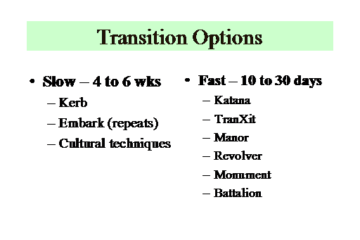 Transition Options<BR>Slow – 4 to 6 wks <BR>Kerb <BR>Embark (repeats) <BR>Cultural techniques<BR>Fast – 10 to 30 days <BR>Katana <BR>TranXit <BR>Manor <BR>Revolver <BR>Monument <BR>Battalion<BR>