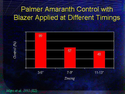 Palmer Amaranth Control with Blazer Applied at Different Timings<BR>Mayo et al. 1995 (KS)<BR>
