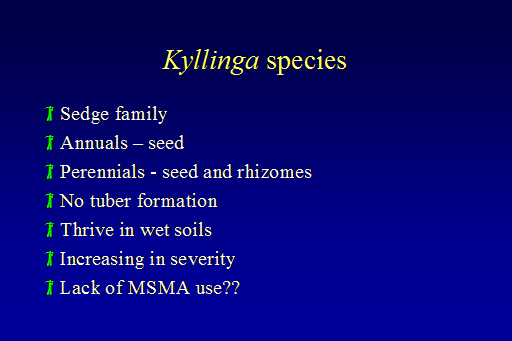 Kyllinga species <BR>Sedge family <BR>Annuals – seed  <BR>Perennials - seed and rhizomes <BR>No tuber formation <BR>Thrive in wet soils <BR>Increasing in severity <BR>Lack of MSMA use??<BR>