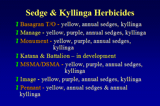 Sedge & Kyllinga Herbicides <BR>Basagran T/O - yellow, annual sedges, kyllinga <BR>Manage - yellow, purple, annual sedges, kyllinga <BR>Monument - yellow, purple, annual sedges,                                                   		      kyllinga <BR>Katana & Battalion – in development <BR>MSMA/DSMA - yellow, purple, annual sedges, 				    kyllinga <BR>Image - yellow, purple, annual sedges, kyllinga <BR>Pennant - yellow, annual sedges & annual kyllinga<BR>