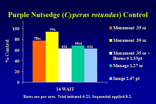Purple Nutsedge (Cyperus rotundus) Control<BR>Rates are per acre. Trial initiated 6-21. Sequential applied 8-2.  <BR>78bc<BR>94a<BR>63d<BR>69cd<BR>63d<BR>