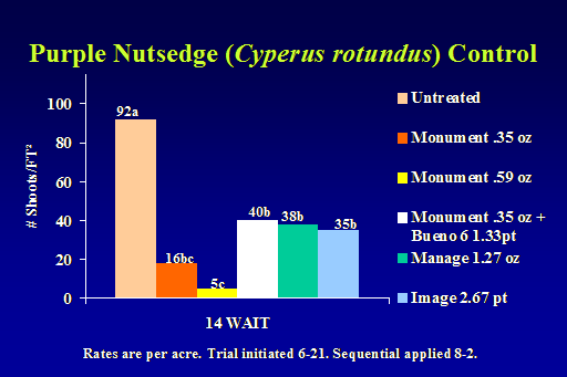 Purple Nutsedge (Cyperus rotundus) Control<BR>Rates are per acre. Trial initiated 6-21. Sequential applied 8-2. <BR>92a<BR>16bc<BR>5c<BR>40b<BR>38b<BR>35b<BR>