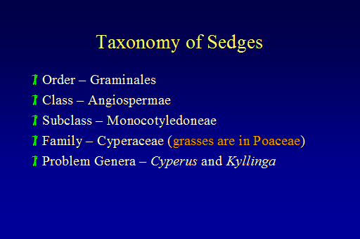 Taxonomy of Sedges<BR>Order – Graminales <BR>Class – Angiospermae <BR>Subclass – Monocotyledoneae <BR>Family – Cyperaceae (grasses are in Poaceae) <BR>Problem Genera – Cyperus and Kyllinga<BR>