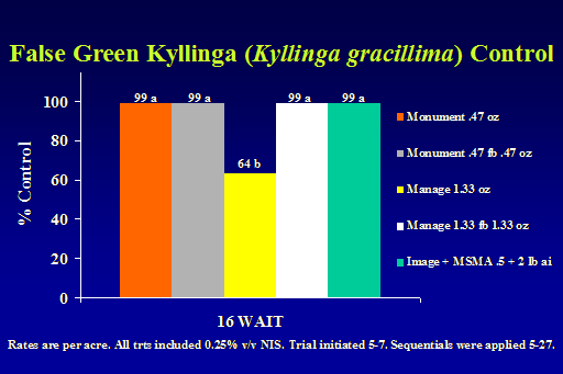 False Green Kyllinga (Kyllinga gracillima) Control<BR>99 a<BR>99 a<BR>64 b<BR>99 a<BR>99 a<BR>Rates are per acre. All trts included 0.25% v/v NIS. Trial initiated 5-7. Sequentials were applied 5-27. <BR>
