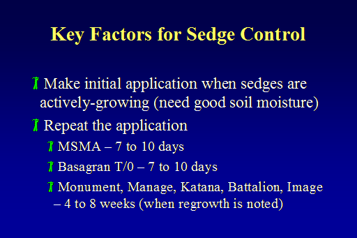Key Factors for Sedge Control<BR>Make initial application when sedges are actively-growing (need good soil moisture) <BR>Repeat the application <BR>MSMA – 7 to 10 days <BR>Basagran T/0 – 7 to 10 days <BR>Monument, Manage, Katana, Battalion, Image – 4 to 8 weeks (when regrowth is noted)<BR>