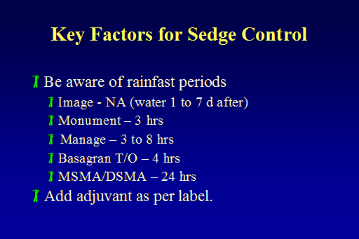 Key Factors for Sedge Control<BR>Be aware of rainfast periods <BR>Image - NA (water 1 to 7 d after) <BR>Monument – 3 hrs <BR>	Manage – 3 to 8 hrs <BR>Basagran T/O – 4 hrs <BR>MSMA/DSMA – 24 hrs <BR>Add adjuvant as per label. <BR> <BR> <BR>