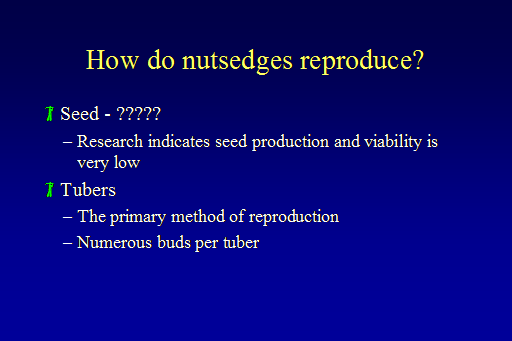 How do nutsedges reproduce?<BR>Seed - ????? <BR>Research indicates seed production and viability is very low <BR>Tubers <BR>The primary method of reproduction <BR>Numerous buds per tuber<BR>