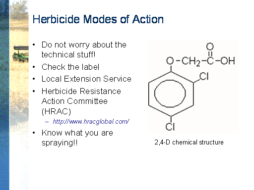 Herbicide Modes of Action<BR>Do not worry about the technical stuff! <BR>Check the label <BR>Local Extension Service <BR>Herbicide Resistance Action Committee (HRAC) <BR>http://www.hracglobal.com/ <BR>Know what you are spraying!!<BR>2,4-D chemical structure<BR>