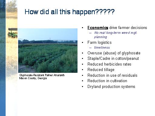 How did all this happen?????<BR>Economics drive farmer decisions <BR>No real long-term weed mgt. planning <BR>Farm logistics <BR>timeliness <BR>Overuse (abuse) of glyphosate <BR>Staple/Cadre in cotton/peanut <BR>Reduced herbicides rates <BR>Reduced tillage <BR>Reduction in use of residuals <BR>Reduction in cultivation <BR>Dryland production systems<BR>Glyphosate-Resistant Palmer Amaranth <BR>Macon County, Georgia<BR>