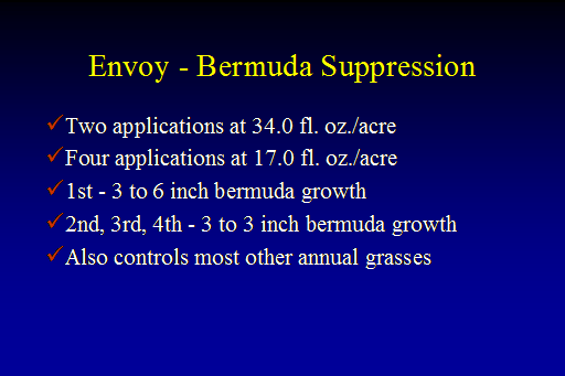 Envoy - Bermuda Suppression<BR>Two applications at 34.0 fl. oz./acre <BR>Four applications at 17.0 fl. oz./acre <BR>1st - 3 to 6 inch bermuda growth <BR>2nd, 3rd, 4th - 3 to 3 inch bermuda growth <BR>Also controls most other annual grasses<BR>