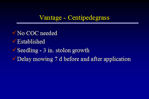 Vantage - Centipedegrass<BR>No COC needed <BR>Established <BR>Seedling - 3 in. stolon growth <BR>Delay mowing 7 d before and after application<BR>