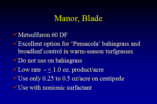 Manor, Blade<BR>Metsulfuron 60 DF <BR>Excellent option for ‘Pensacola’ bahiagrass and broadleaf control in warm-season turfgrasses <BR>Do not use on bahiagrass  <BR>Low rate  - < 1.0 oz. product/acre <BR>Use only 0.25 to 0.5 oz/acre on centipede <BR>Use with nonionic surfactant <BR>