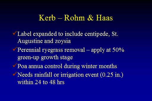 Kerb – Rohm & Haas<BR>Label expanded to include centipede, St. Augustine and zoysia <BR>Perennial ryegrass removal – apply at 50% green-up growth stage <BR>Poa annua control during winter months <BR>Needs rainfall or irrigation event (0.25 in.) within 24 to 48 hrs<BR>