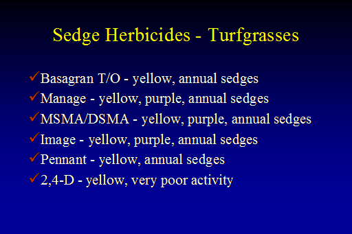 Sedge Herbicides - Turfgrasses<BR>Basagran T/O - yellow, annual sedges <BR>Manage - yellow, purple, annual sedges <BR>MSMA/DSMA - yellow, purple, annual sedges <BR>Image - yellow, purple, annual sedges <BR>Pennant - yellow, annual sedges <BR>2,4-D - yellow, very poor activity<BR>
