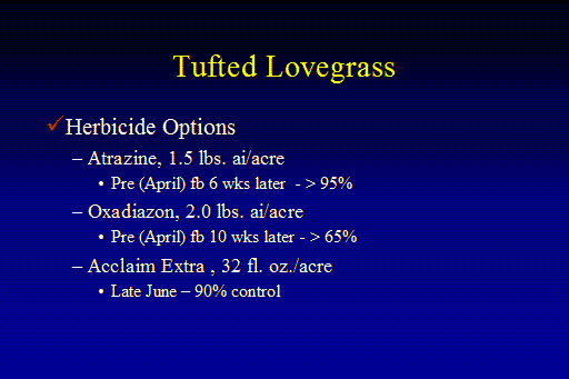 Tufted Lovegrass <BR>Herbicide Options <BR>Atrazine, 1.5 lbs. ai/acre <BR>Pre (April) fb 6 wks later  - > 95% <BR>Oxadiazon, 2.0 lbs. ai/acre <BR>Pre (April) fb 10 wks later - > 65% <BR>Acclaim Extra , 32 fl. oz./acre <BR>Late June – 90% control <BR>