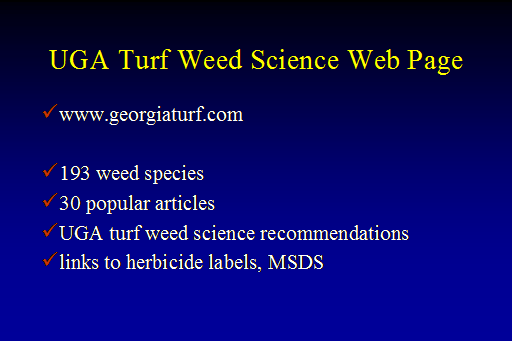 UGA Turf Weed Science Web Page<BR>www.georgiaturf.com <BR> <BR>193 weed species <BR>30 popular articles <BR>UGA turf weed science recommendations <BR>links to herbicide labels, MSDS<BR>
