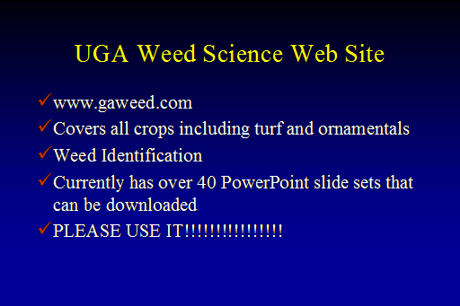 UGA Weed Science Web Site<BR>www.gaweed.com <BR>Covers all crops including turf and ornamentals <BR>Weed Identification <BR>Currently has over 40 PowerPoint slide sets that can be downloaded <BR>PLEASE USE IT!!!!!!!!!!!!!!!!<BR>
