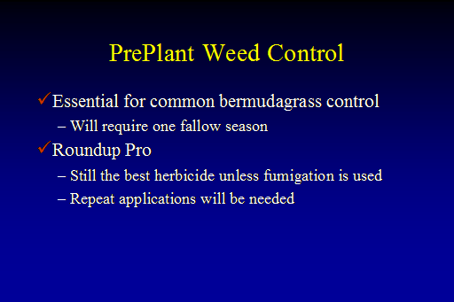 PrePlant Weed Control<BR>Essential for common bermudagrass control <BR>Will require one fallow season <BR>Roundup Pro <BR>Still the best herbicide unless fumigation is used <BR>Repeat applications will be needed<BR>