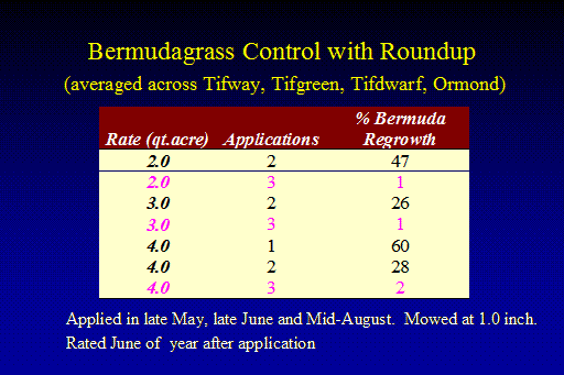 Bermudagrass Control with Roundup  (averaged across Tifway, Tifgreen, Tifdwarf, Ormond)<BR>Applied in late May, late June and Mid-August.  Mowed at 1.0 inch.  <BR>Rated June of  year after application<BR>